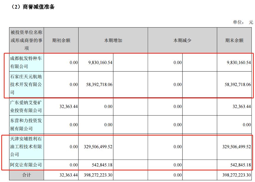 可以看到,2016年的商譽減值共有四筆,其中對天元航地和安埔勝利的減值占了大頭,分別為5839.27萬元和3.295億元。而當初這四項并購合計花費了約8.9億元。