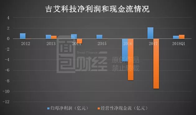 但是如果觀察公司近年來的現(xiàn)金流狀況,則沒有這么樂觀。2016年和2017年,公司經(jīng)營性凈現(xiàn)金流分別為凈流出約7.9億和9.5億。直接看吉艾科技上市以來的利潤和現(xiàn)金流情況。
