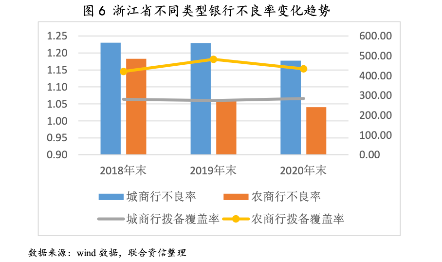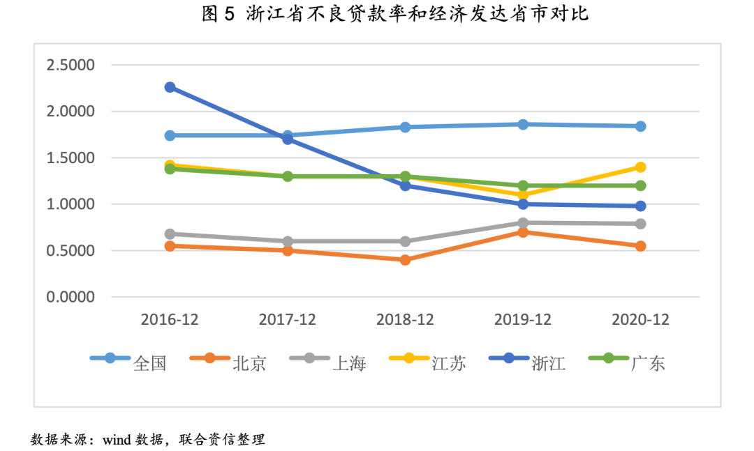 得益于較高的經(jīng)濟發(fā)展水平以及自身產(chǎn)業(yè)較為成熟等因素,浙江省銀行業(yè)金融機構信貸資產(chǎn)質(zhì)量保持在較好水平;但另一方面,由于外向型經(jīng)濟對國際經(jīng)濟與政治環(huán)境依關聯(lián)度較高,在中美貿(mào)易戰(zhàn)升級以及疫情環(huán)境下產(chǎn)業(yè)鏈轉(zhuǎn)移背景下,企業(yè)或面臨一定經(jīng)營壓力,從而對銀行業(yè)資產(chǎn)質(zhì)量維持產(chǎn)生不利影響。2018年以前,由于浙江地區(qū)民間借貸以及擔保互保現(xiàn)象普遍,在當時“三去一降一補”的大政策背景下?lián)f湷霈F(xiàn)斷裂,導致省內(nèi)銀行業(yè)資產(chǎn)質(zhì)量承壓,整體信貸資產(chǎn)質(zhì)量低于全國平均水平。近年來,隨著互保鏈的解開以及銀行加大對不良信貸資產(chǎn)的處置清收力度,整體信貸資產(chǎn)質(zhì)量明顯改善,不良率顯著下降。目前來看已經(jīng)優(yōu)于全國平均水平,與經(jīng)濟發(fā)達省市相比而言,貸款資產(chǎn)質(zhì)量要優(yōu)于廣東和江蘇。2020年以來,受經(jīng)濟下行壓力影響疊加新冠肺炎疫情沖擊,全省銀行業(yè)金融機構不良貸款余額和不良貸款率略有上升。根據(jù)《浙江省金融運營報告(2021)》,2020年,浙江省銀行業(yè)金融機構全年共處置不良貸款1429.1億元,同比增加70.0億元;截至2020年末,浙江省銀行業(yè)金融機構不良貸款余額為1402.0億元,不良貸款率為0.98%,比年初上升0.07個百分點。但浙江省的外向型經(jīng)濟使得區(qū)域內(nèi)企業(yè)對于進出口貿(mào)易依賴度較高,當前中美貿(mào)易戰(zhàn)逐漸升級,部分以美國為核心的貿(mào)易組織嘗試逐步降低對華貿(mào)易依賴度,同時伴隨著疫情環(huán)境下運輸成本上升和產(chǎn)業(yè)鏈向馬來西亞、印尼等國家轉(zhuǎn)移,浙江省與外貿(mào)密切相關的企業(yè)或?qū)⒚媾R一定沖擊。需關注在當前經(jīng)濟環(huán)境和政治局勢下,企業(yè)經(jīng)營壓力上升給浙江省銀行業(yè)信貸資產(chǎn)質(zhì)量帶來的負面影響。