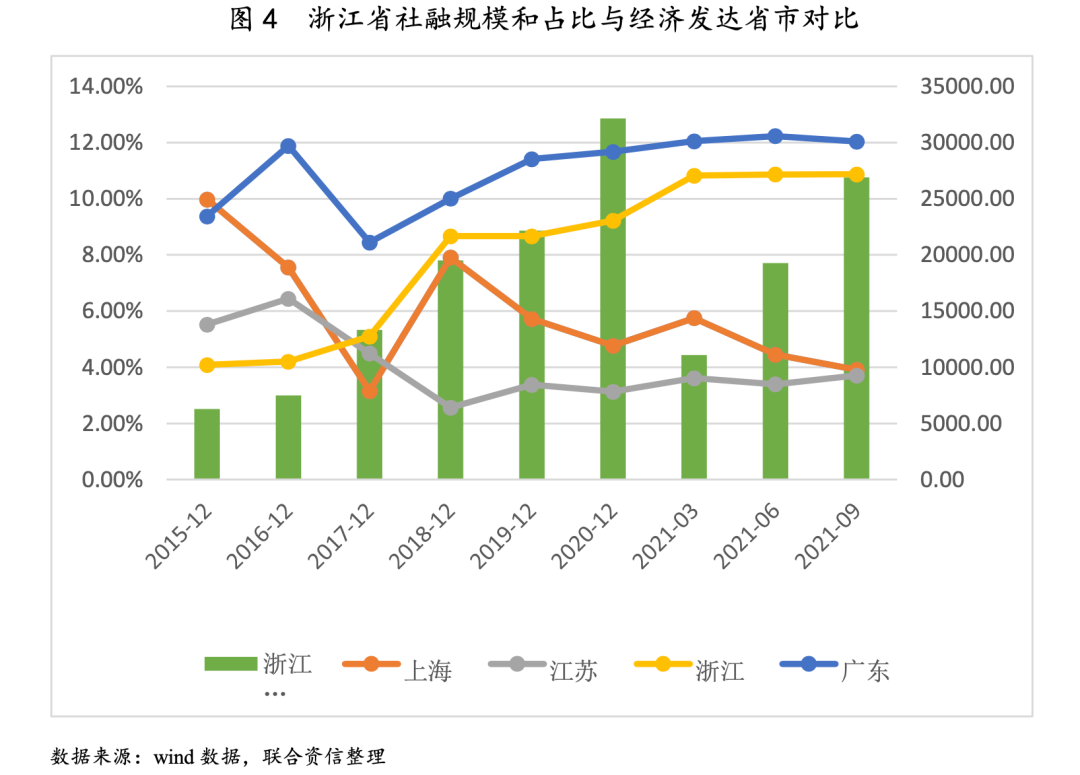從金融業(yè)發(fā)展角度來看,浙江省較為突出的區(qū)位優(yōu)勢,以及領先的經(jīng)濟增速為地方金融行業(yè)發(fā)展奠定了良好的經(jīng)濟基礎。近年來,浙江省金融業(yè)整體發(fā)展平穩(wěn),對實體經(jīng)濟的支持力度不斷攀升,自2016年以來浙江省社融規(guī)模呈快速增長態(tài)勢,并且其社融占全國社融的比例明顯高于上海和浙江等經(jīng)濟發(fā)達省市。較好的社融增長體現(xiàn)了浙江地區(qū)金融體系對實體經(jīng)濟的強有力的支持能力。