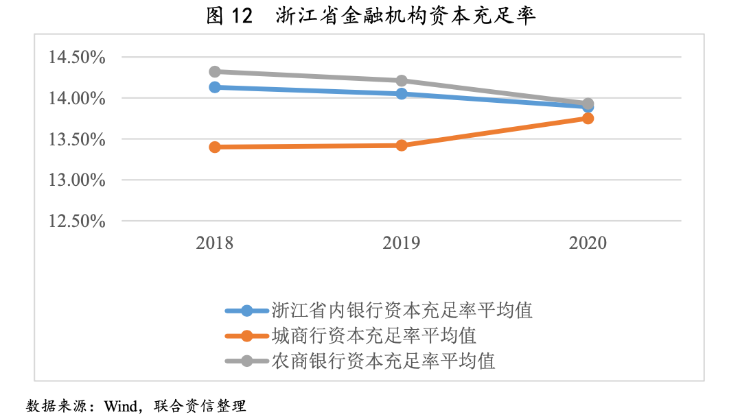 從浙江省內(nèi)城商行及農(nóng)商銀行資本充足率平均值差異情況看,近年來,浙江省內(nèi)農(nóng)商銀行資本充足率平均值略高于城商行資本充足率平均值水平,一方面系農(nóng)商銀行個體體量相較城商行而言體量相對較低,對具有一定規(guī)模或資金需求相對較高的客戶服務能力相對較弱,且農(nóng)商銀行主要集中于地方縣域,客戶類型中涉及風險權重相對較小的小微企業(yè)及個體工商戶等占客戶總量比重相對較高,帶來的資本消耗相對較低。但是,近年來,浙江省內(nèi)城商行資本充足率平均值呈上升趨勢,一方面系城商行近年來業(yè)務拓展相較于省內(nèi)農(nóng)商銀行而言在資本消耗力度方面相對較高,對資本補充需求高于省內(nèi)農(nóng)商銀行,且浙江省內(nèi)城商行多由地方政府參股,相較于普遍由民營股東組成且股權結構散的省內(nèi)農(nóng)商銀行而言,省內(nèi)城商銀行股東增資意愿相對較高,相對較易獲得來自股東的資本補充。