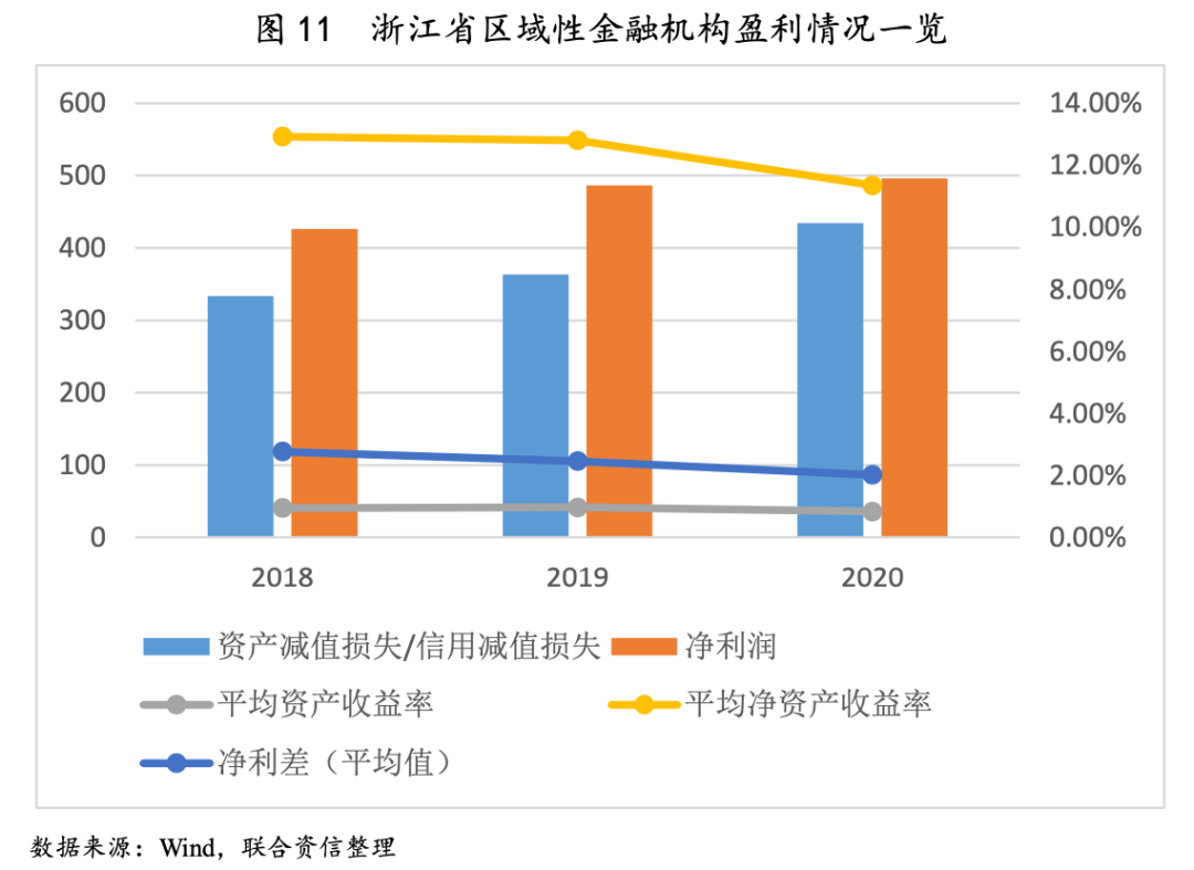 浙江省內(nèi)區(qū)域性銀行收入結構相對較好,盈利能力相對較強;但凈利差有所收窄,且較高的減值準備計提不利于盈利能力體現(xiàn)。從選取樣本中反映的收入結構看,近年來,浙江省內(nèi)區(qū)域性銀行利息凈收入、手續(xù)費與傭金凈收入和投資收益之和呈逐年上升的態(tài)勢。其中,利息凈收入仍為浙江省內(nèi)區(qū)域性銀行的主要收入來源,且占三類收入渠道之和的比重呈小幅提升的態(tài)勢,2018、2019和2020年利息凈收入分別占當年營業(yè)收入的68.67%、67.68%和71.89%;投資收益增速及占三類收入渠道之和的比重有所下降,但投資收益占三類收入渠道之和的比重相對適中,2018、2019和2020年投資收益分別占當年營業(yè)收入的23.06%、22.35%和22.51%;手續(xù)費及傭金凈收入占三類收入渠道之和的比重持續(xù)保持在相對較低水平。從收入結構可以得出,浙江省內(nèi)區(qū)域性銀行在保證信貸資產(chǎn)投放能夠帶來良好收益的同時,對于富余資金的營運能力相對較強,整體收入結構相對良好。近年來,在國家倡導金融機構服務實體經(jīng)濟,讓利于實體經(jīng)濟、小微企業(yè)等政策的持續(xù)推進,以及浙江省地方法人金融機構已于2020年內(nèi)完成存量浮動利率貸款定價基準的轉(zhuǎn)換的影響下,浙江省內(nèi)區(qū)域性金融機構貸款定價水平持續(xù)下降,疊加同業(yè)攬存競爭力持續(xù)上升帶來的負債成本增長,共同導致近年來利差水平持續(xù)縮窄,2018、2019和2020年凈利差平均值分別為2.77%、2.46%和2.02%。此外,浙江省區(qū)域性金融機構持續(xù)加大資產(chǎn)減值損失的計提力度(見圖10),對利潤實現(xiàn)形成一定影響,近年來凈利潤增速明顯下降,相關收益率指標有所下降,但相較于其他地區(qū)同業(yè)機構來看,仍處在相對較好水平。