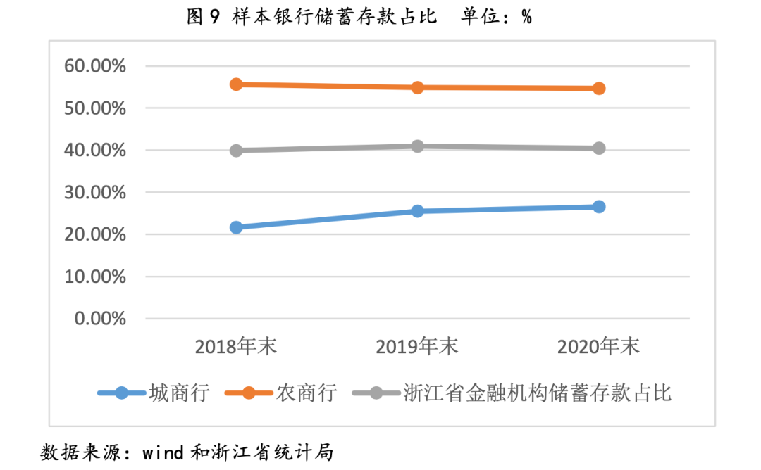 從存款結構來看,公司存款的拉動作用較為突出。截至2020年末,浙江省金融機構本外幣存款余額15.23萬億元,較上年末增長15.94%,增速較上年略有提升。其中,住戶存款占比40.44%,增速較去年有所下滑。從樣本數(shù)據(jù)來看,不同類型銀行的存款來源具有一定差異性,城商行對儲蓄存款的依賴性相對較低,農(nóng)商行相對更多的依賴儲蓄存款。主要是因為農(nóng)商行在較為下沉的網(wǎng)點覆蓋面上而言具有一定的個人客戶營銷優(yōu)勢,而城商行在資本實力以及與政府合作方面具備較強競爭力,因此公司存款為此類銀行的主要來源。整體而言,得益于浙江省區(qū)域經(jīng)濟保持較強活力,銀行業(yè)在存款發(fā)展上面臨的壓力相對較小;同時整體儲蓄存款維持在40%以上,存款穩(wěn)定性較好,并且中小型農(nóng)商銀行擁有更高的個人存款占比,存款穩(wěn)定性更強。但同時儲蓄存款一般具有更高的存款成本,也在一定程度上推高了中小農(nóng)商銀行的負債成本。