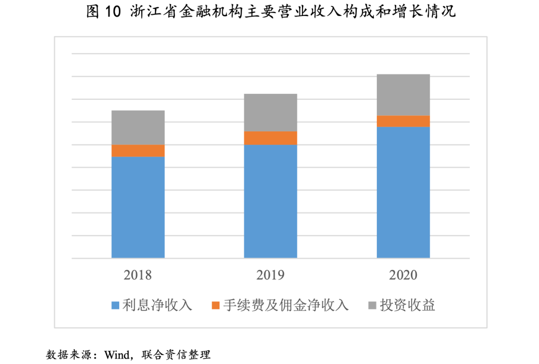 3.浙江省銀行業(yè)收入實現(xiàn)能力較好,收入結構較為穩(wěn)定,隨著業(yè)務回歸本源,利息凈收入占比上升;同業(yè)競爭加劇、利率市場化以及減費讓利政策均對銀行業(yè)利潤空間形成擠壓。