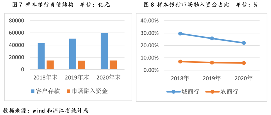 2.客戶存款依舊是銀行的主要負債來源,對于市場融入資金的依賴度逐漸下降,高成本儲蓄負債對于農(nóng)商行成本管控帶來負面影響。