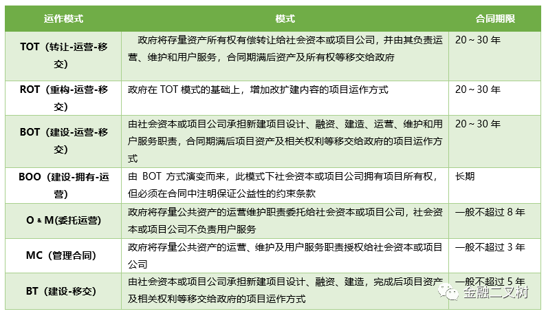 PPP項目主要有7種運作模式,詳細情況如下表所示: