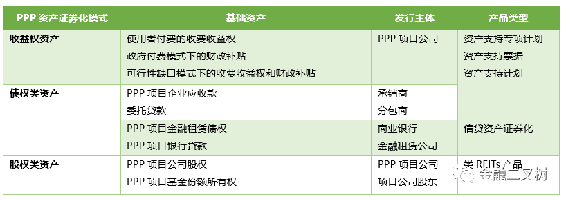 PPP項目資產證券化按照基礎資產分類可以分為收益權資產、債權資產和股權資產。不同的基礎資產,對應的資產證券化產品以及原始權益人(發行人)均有不同,具體如下表所示: