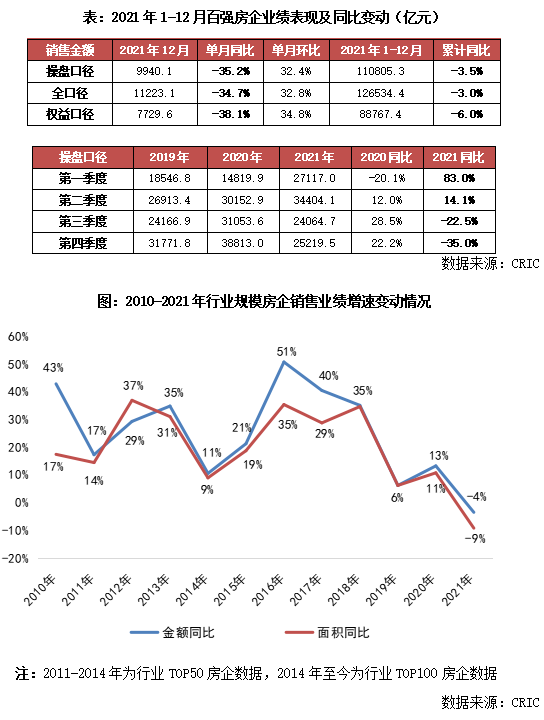 2021年12月,TOP100房企實現銷售操盤金額9940.1億元,單月業績同比降低35.2%,較11月環比增長32.4%。從累計業績來看,年內百強房企累計業績增速持續放緩,截至12月末累計銷售操盤金額較2020年同比降低3.5%,規模房企銷售增速罕見出現負增長。