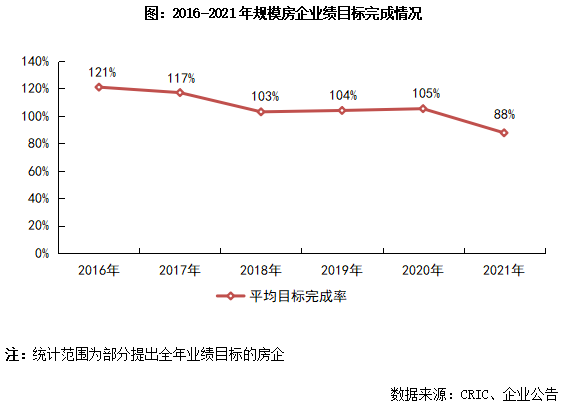 2021年,規模房企整體的目標完成情況遠不及歷史同期,規模房企平均目標完成率不到90%,明顯低于近年105%以上的平均水平。在披露年度業績目標的部分規模房企中,截至12月末有逾8成房企未完成全年業績目標。但綠城、華潤、金地、濱江等房企仍超額完成全年目標??梢姡词鼓陜纫幠7科笠褜I績增長保持了謹慎預期,并適度調降了銷售目標的情況下,但下半年市場大幅降溫、企業業績持續萎縮的影響下,多數企業的業績壓力仍然較大。