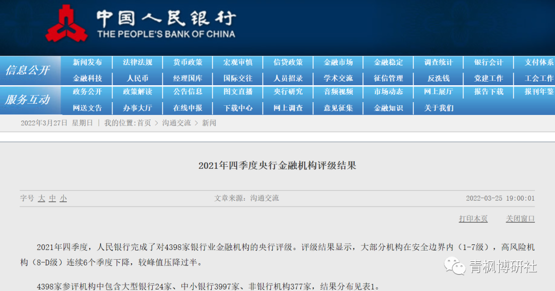 (一)2022年3月25日,央行公布2021年四季度央行金融機構評級結果。結果顯示,截至2021年底,我國高風險機構數量已降至316家,較649家(2019年三季度)的峰值減少333家,而這已經是連續6個季度下降。