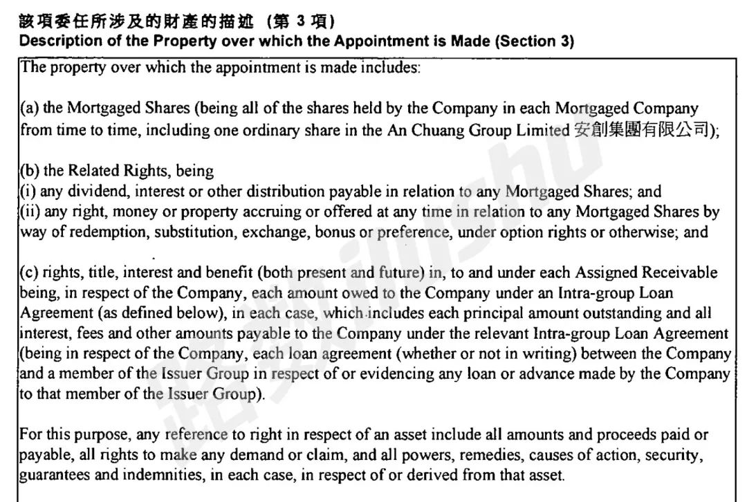 可以看到,Kroll作為接管人可以行使各項股東權益,比如資產收益權、處置權。細到花樣年所持有的一家名為安創集團有限公司的普通股。