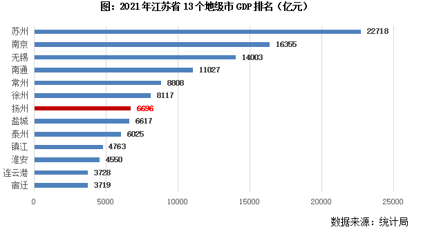 2021年,揚州GDP6696億元,在江蘇省13個地級市排名第七位,同比增長7.4%。城鎮居民人均可支配收入50947元,在全省排名第八位,同比增長7.9%。2020年,揚州常住人口456萬人,在全省排名第十位,其中城鎮常住人口324萬人,城鎮化率71%。