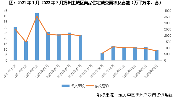 2021年1-7月,揚州房地產市場相較火爆,主城區商品住宅月均成交面積約27萬平方米。尤其是3月,成交面積多達43萬平方米,創2019年以來單月新高。8月,受疫情影響,揚州房地產市場陷入停擺。9月以來,揚州市場持續轉冷,成交大幅下滑,月均成交跌至11萬平方米,較1-7月月均下降59%。在售項目成交去化顯著放緩,新開盤項目平均去化率由43%跌至18%,流量盤月均成交20-30套,滯銷盤月均成交不足10套。