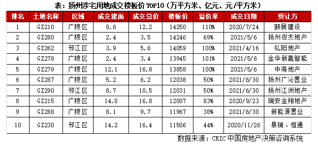 2020年、2021年上半年揚州土拍市場異常火爆,地王樓板價超1.4萬元/平方米。例如2020年7月24日,頤居建設總價12.2億元競得廣陵區GZ210地塊,樓板價14250元/平方米,創全市新的單價地王,溢價率高達110%。