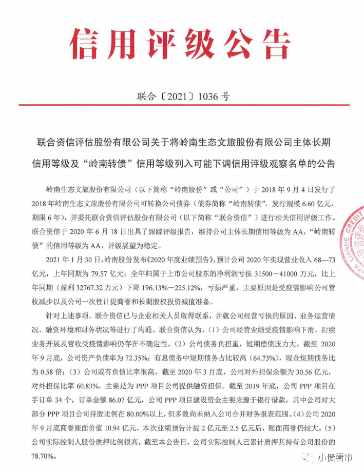 近日,聯合資信公告稱,將嶺南股份(002717.SZ)主體長期信用等級及“嶺南轉債”的信用等級列入可能下調信用評級觀察名單。