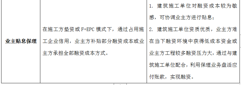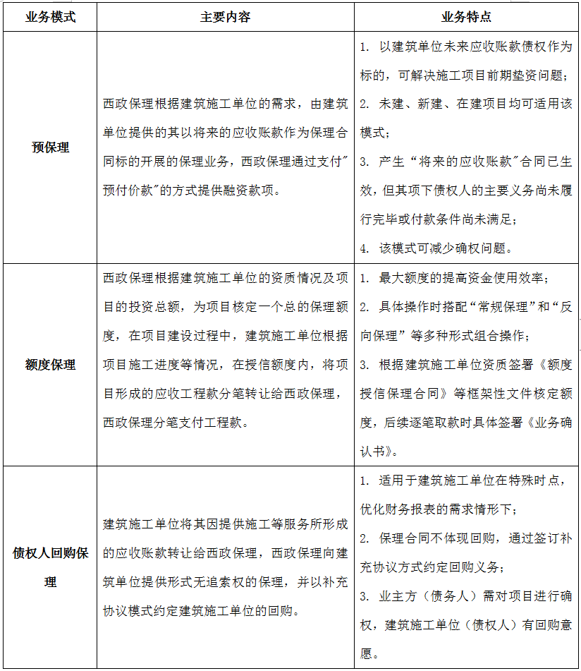 對于國央企建筑施工單位的供應鏈保理業務,目前主要的業務模式包括以國央企建筑施工單位未來應收賬款為保理合同標的的預保理業務;給予國央企建筑施工單位授信額度的額度保理;債權人回購保理及業主貼息保理模式。具體如下: