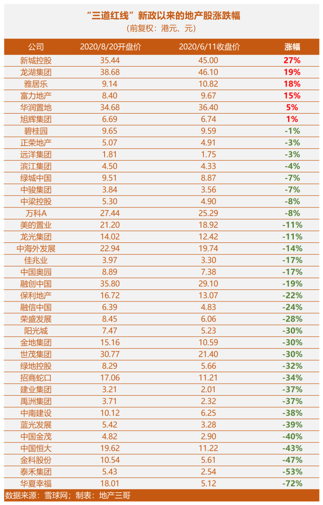 一、“三道紅線”以來的地產(chǎn)股漲跌