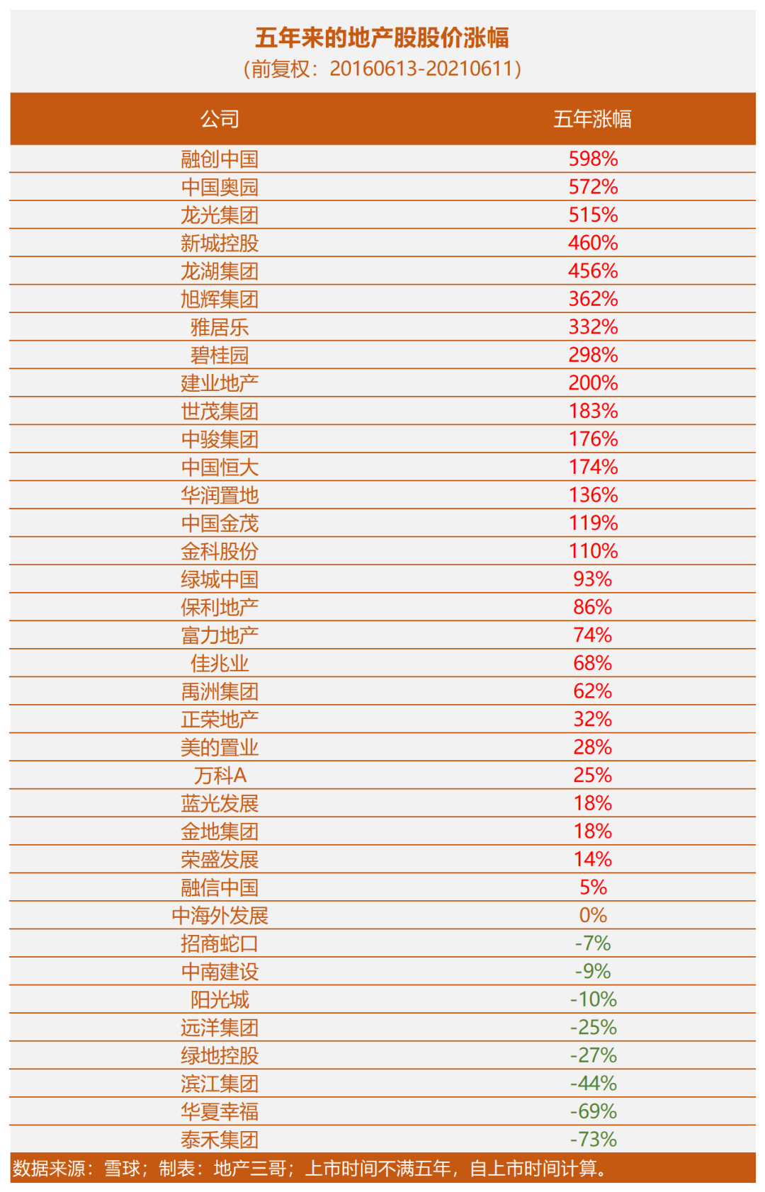 融創(chuàng),這五年是地產(chǎn)股價漲幅的老大,598%。融創(chuàng)的股價主要漲在2017年,如果沒有后期的新政,老孫這個筋斗云,可能還要飛得更高。