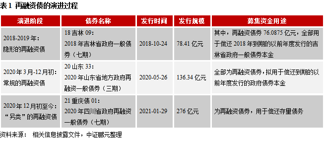 伴隨2015年發(fā)行的首批地方政府債的陸續(xù)到期,自2018年4月起,我國地方政府債在新增債、置換債(含公開發(fā)行和定向置換)的基礎(chǔ)上再添新品種——再融資債(按用途劃分),包括再融資一般債和再融資專項(xiàng)債。不過,彼時(shí)查找再融資債還只能通過地方政府債的募集資金用途來進(jìn)行,債券全稱上并未有體現(xiàn);直到2020年3月,再融資債才直接出現(xiàn)在債券全稱中。從最初的創(chuàng)設(shè)初衷和發(fā)行情況來看,再融資債的募集資金應(yīng)用于償還到期的地方政府債券本金,其中再融資一般債納入一般公共預(yù)算管理,用于償還到期的一般債券本金;再融資專項(xiàng)債納入政府性基金預(yù)算管理,用于償還到期的專項(xiàng)債本金。我們認(rèn)為,再融資債之所以成為地方政府債的新品種,是大規(guī)模的、早年發(fā)行的地方政府債到期后需要“借新還舊”所導(dǎo)致的結(jié)果,符合市場預(yù)期,并不意味著地方政府舉債、化債等相關(guān)政策出現(xiàn)重大調(diào)整。但值得注意的是,從2020年12月起再融資債的募集資金用途悄然發(fā)生了變化,從明確指出“用于償還到期的地方政府債券本金”變成了模糊的“用于償還存量債務(wù)”。至此,再融資債完成了又一次的“迭代”,市場將這一批再融資債命名為“另類”再融資債。下表中,我們選取了三只不同階段發(fā)行的地方政府債為樣本,呈現(xiàn)了再融資債的演進(jìn)過程,便于大家理解。