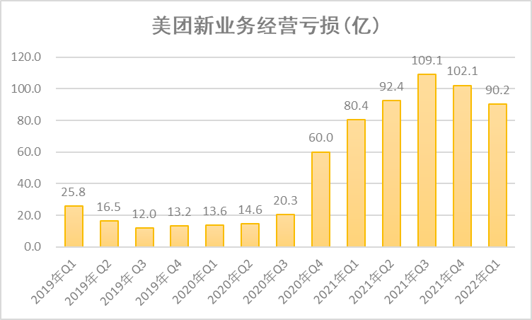 而美團(tuán)為此付出的代價(jià)則顯而易見。2021年,該三項(xiàng)業(yè)務(wù)便給美團(tuán)帶來(lái)了高達(dá)384億元的虧損。受此拖累,新業(yè)務(wù)虧損一路走高,至2021年Q3和2021年Q4,美團(tuán)新業(yè)務(wù)虧損金額則分別達(dá)到驚人的109億元和102億元。
