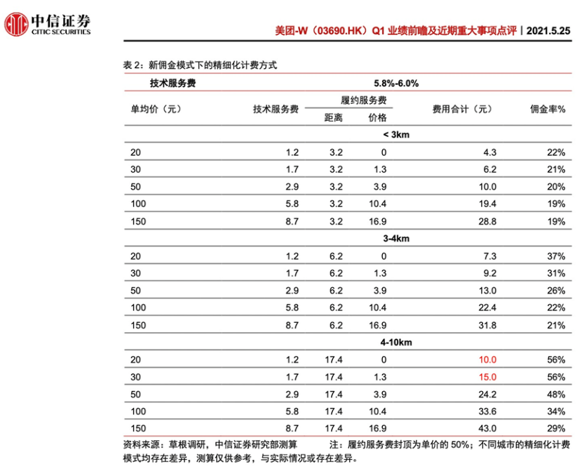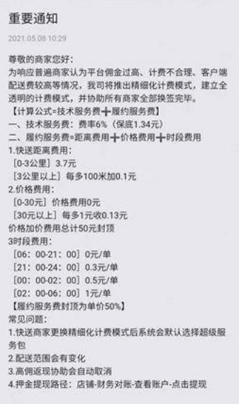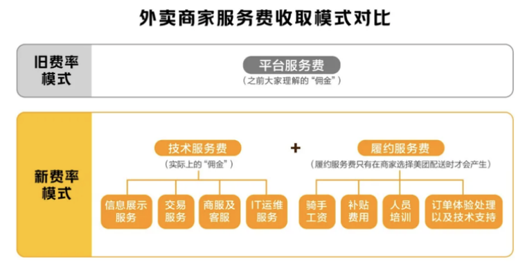 2021年初,為緩解監(jiān)管壓力和商家爭(zhēng)議,美團(tuán)開始了傭金“透明化改革”,將原先按比例收取的傭金,拆分成技術(shù)服務(wù)費(fèi)和履約服務(wù)費(fèi)兩部分,并通過時(shí)間分段計(jì)費(fèi)和距離分段計(jì)費(fèi)的方式對(duì)履約服務(wù)費(fèi)進(jìn)行約定。