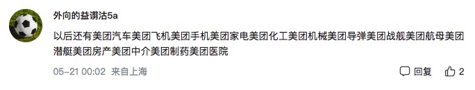 “以后還有美團(tuán)汽車、美團(tuán)飛機(jī)、美團(tuán)手機(jī)、美團(tuán)家電、美團(tuán)化工、美團(tuán)機(jī)械、美團(tuán)導(dǎo)彈、美團(tuán)戰(zhàn)艦、美團(tuán)航母、美團(tuán)潛艇、美團(tuán)房產(chǎn)、美團(tuán)中介、美團(tuán)制藥和美團(tuán)醫(yī)院。”