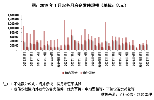 1月發(fā)債457.20億元,環(huán)比上升44.7%,同比下降64.3%。其中,境外發(fā)債166.40億元,環(huán)比上升118.5%,同比下降80.5%,主要在于當(dāng)前仍有房企境外債出現(xiàn)違約情況,投資者信心不足,境外發(fā)債相對較難,而在發(fā)行境外債的企業(yè)中,有相當(dāng)一部分企業(yè)是尋求債券要約交換,真正實(shí)現(xiàn)新債或者舊債再循環(huán)融資的企業(yè)相對較少。境內(nèi)發(fā)債290.90億元,環(huán)比上升21.3%,同比下降32.3%,其中,公司債發(fā)行68.0億元,同比下降76.3%,環(huán)比下降32.7%;中期票據(jù)發(fā)行143.9億元,環(huán)比上升63.7%,同比上升157.9%;融資券發(fā)行78.9億元,環(huán)比上升55.0%,同比上升13.2%。