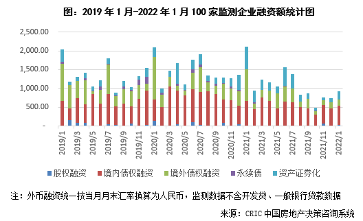 2022年1月100家典型房企的融資總量為929.46億元,環(huán)比上升26%,同比下降56%。自2019年以來,每年年初房企融資量都相對較大,均超過2000億元,而本月融資量不足千億元,一方面在當(dāng)前房企危機(jī)仍未全面解除的情況下,金融機(jī)構(gòu)當(dāng)前白名單企業(yè)相對較少,放款較為謹(jǐn)慎;另一方面,部分企業(yè)為緩解年初的償債壓力已提前償還債券,同時也減少新增融資計劃,導(dǎo)致融資量同比下滑較大。從融資結(jié)構(gòu)來看,境內(nèi)債權(quán)融資499.08億元,環(huán)比上升9.8%,同比下降24.6%;境外債權(quán)融資169.66億元,環(huán)比上升10.0%,同比下降80.1%;本月資產(chǎn)證券化有所回升,融資223.01億元,環(huán)比上升97.9%,同比下降63.0%。