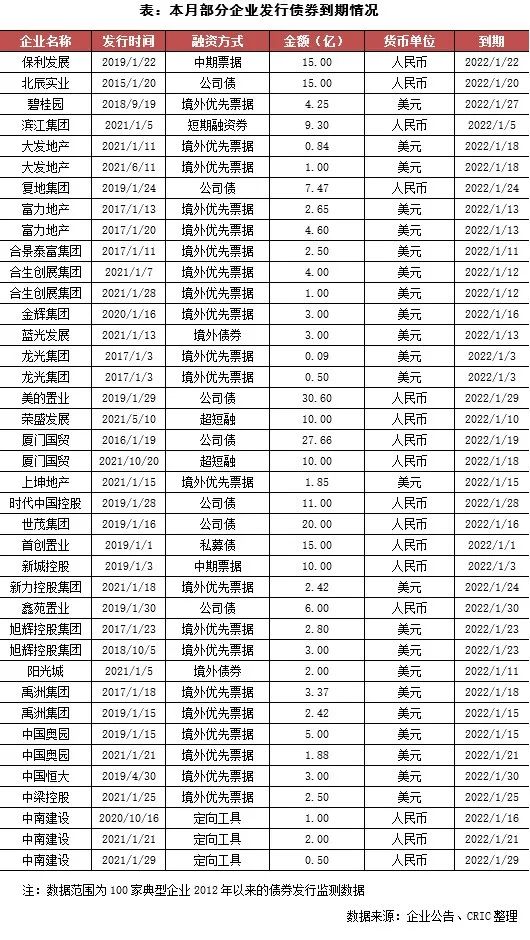 本月房企有39筆債券到期,金額共計594.22億元,環(huán)比上升77.0%,到期債券只數(shù)環(huán)比增加8只,年初企業(yè)的償債壓力較大。到期金額最高的債券為中國奧園2019年1月發(fā)行的一筆5億美元的境外優(yōu)先票據(jù),但其于1月19日公告稱將不會支付于2022年1月到期票據(jù)的余下本金及最后一期利息,債務(wù)違約。值得注意的是,本月有上坤和榮盛發(fā)展就企業(yè)存續(xù)期境外債完成了部分債券的交換要約,相當(dāng)于2022年1月到期的債券到期時間已經(jīng)成功延期。