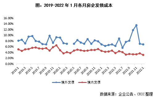 2022年1月100家典型房企新增債券類融資成本4.53%,較2021年全年下降0.76pct,其中境外債券融資成本達(dá)6.85%,下降0.19pct,境內(nèi)債券融資成本3.20%,下降0.87 pct。環(huán)比2021年12月來看,總?cè)谫Y成本環(huán)比上升0.01pct,境外融資成本環(huán)比下降0.16pct,境內(nèi)融資成本環(huán)比下降0.53pct。境內(nèi)發(fā)債的企業(yè)中,可以進(jìn)行發(fā)債的企業(yè)成本相對較低,融資利率在2.50%-4.00%間,白名單企業(yè)繼續(xù)發(fā)揮融資優(yōu)勢,繼續(xù)發(fā)行利率較低的債券;境外發(fā)債成本方面,旭輝、遠(yuǎn)洋等發(fā)行了綠色擔(dān)保票據(jù),其成本不超過5%,也相對較低,還有部分企業(yè)完成了境外債的交換要約和額外發(fā)行,成本相對較高。