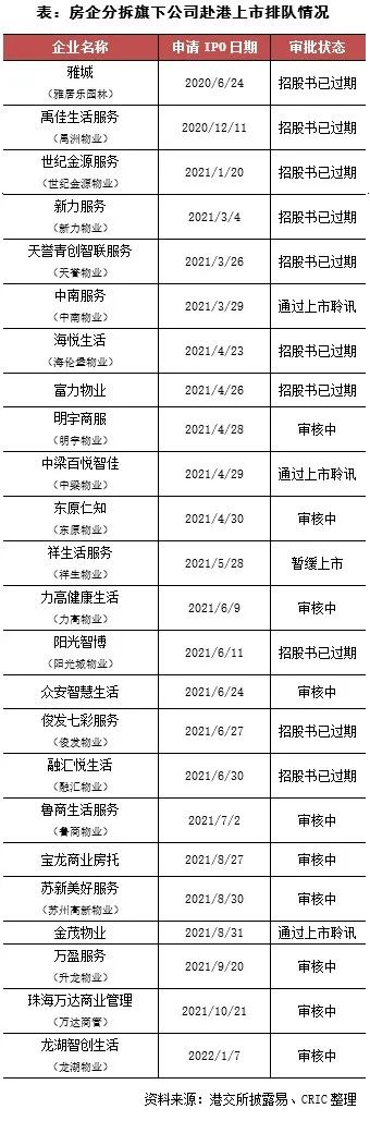 在房企分拆旗下公司上市方面,本月7日龍湖智創(chuàng)生活向港交所首次遞交了招股說明書,此外魯商生活服務(wù)和眾安智慧生活也分別在18日和30日更新了招股書。因此截至2022年1月底,在港交所遞交過招股書而仍未上市的房企旗下公司共有24家,其中有多家企業(yè)的招股書都已過期,未來是否還會堅(jiān)持上市有待觀察。除此之外,期后金茂物業(yè)在2月6日通過了上市聆訊,有可能很快就會完成IPO。