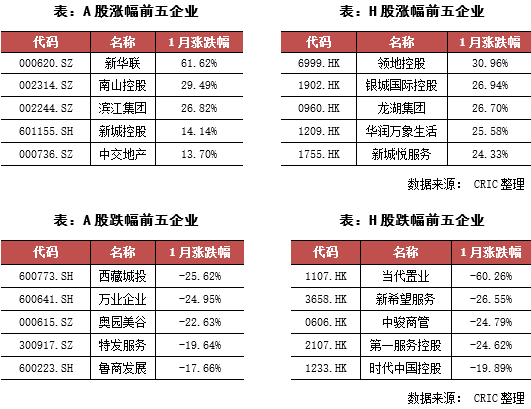 在A股房企方面,本月新華聯(lián)的漲幅較大,企業(yè)股價在1月有10個漲停板,同時也有5個跌停板,大起大落之下最終整月漲幅達(dá)到了61.62%,使其成為A股漲幅最大的房企。