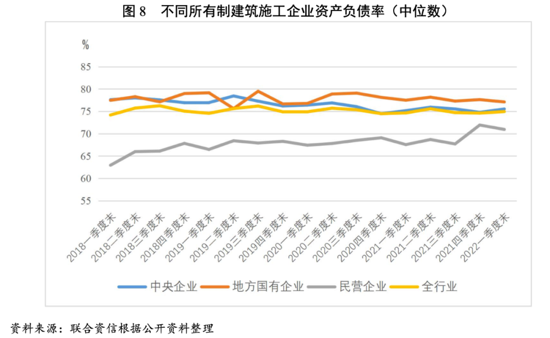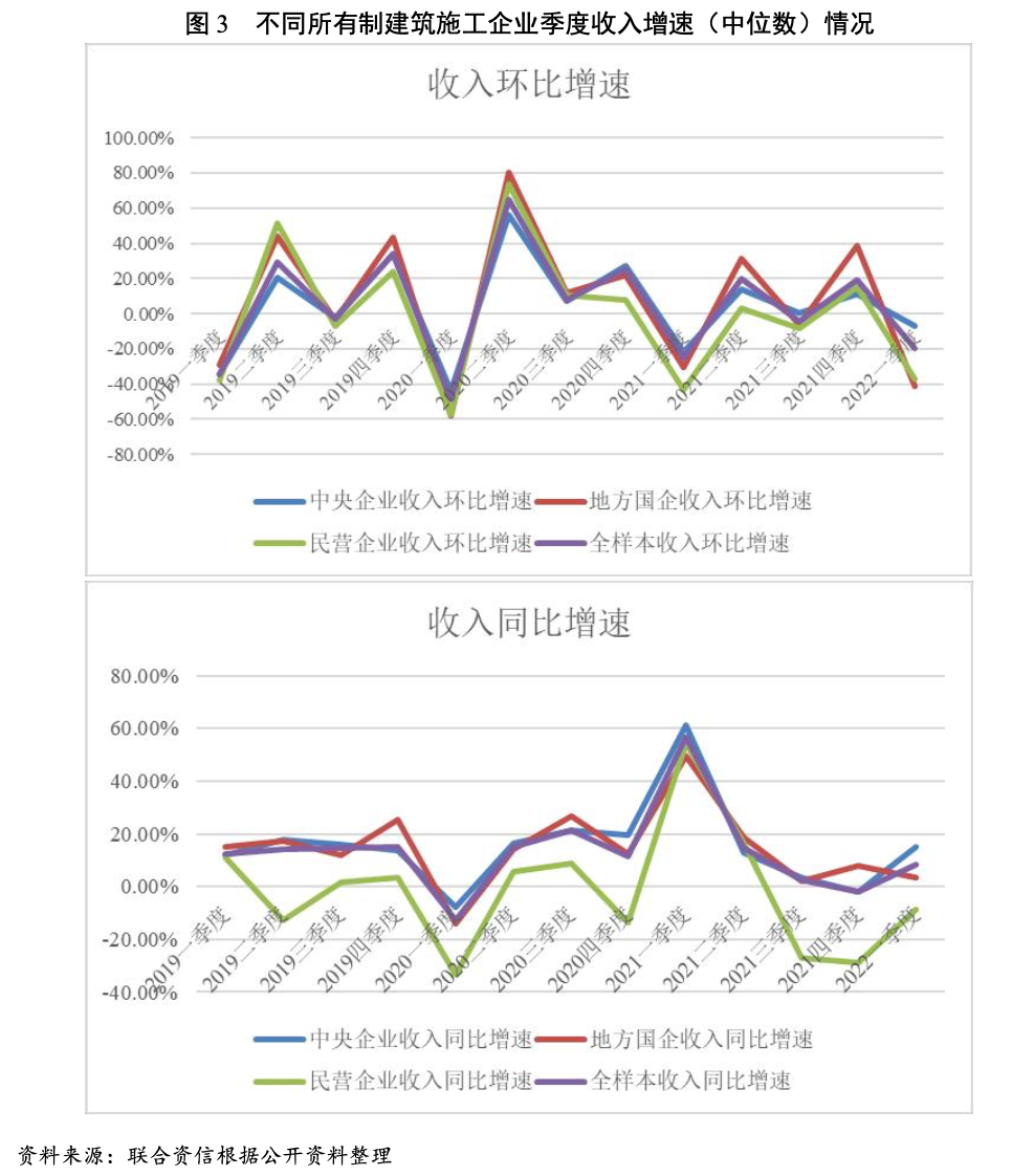 從樣本企業(yè)來看,2022年一季度,建筑施工企業(yè)營業(yè)收入和利潤總額環(huán)比增速呈負(fù)增長,延續(xù)下行趨勢,受主要原材料價(jià)格上漲影響利潤率水平有所下降。其中,中央企業(yè)和地方國有企業(yè)在收入和利潤總額增速方面明顯高于民營企業(yè),行業(yè)集中度進(jìn)一步提高;償債壓力方面,建筑施工企業(yè)流動性壓力進(jìn)一步顯現(xiàn),短期流動性趨緊,且行業(yè)分化明顯,聯(lián)合資信將對償債指標(biāo)明顯弱化及資金鏈壓力較為突出的企業(yè)保持關(guān)注。