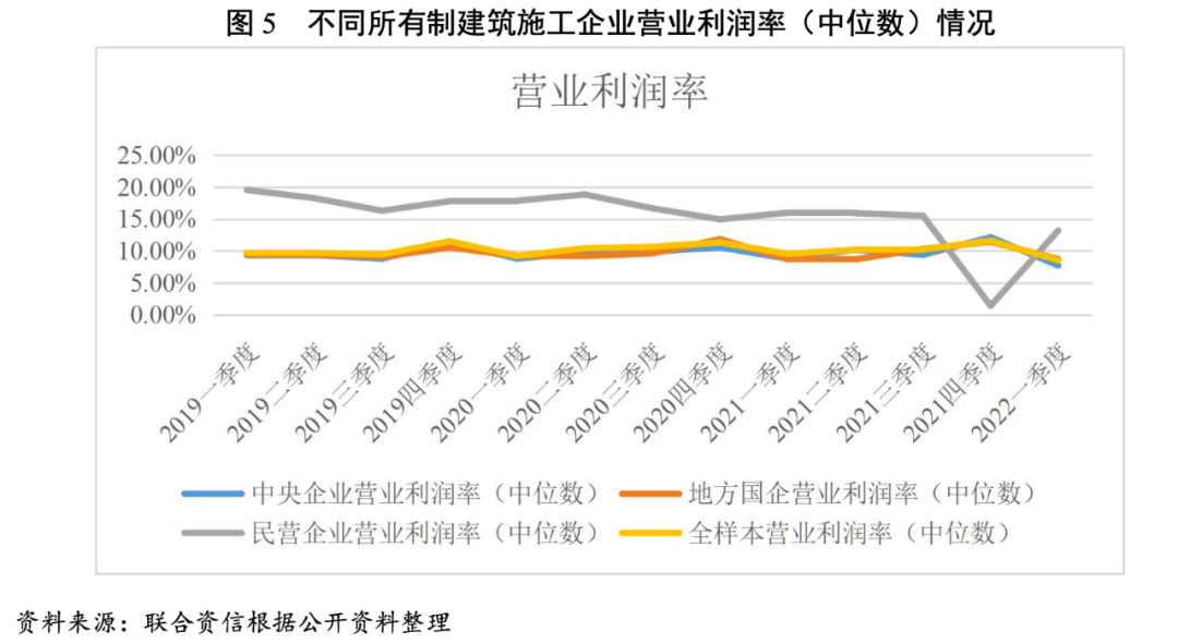從不同所有制的建筑施工企業(yè)來看,2022年一季度,中央企業(yè)、地方國有企業(yè)與民營企業(yè)之間的收入增速存在分化。其中,中央企業(yè)和地方國有企業(yè)的收入和利潤同比增速均明顯高于民營企業(yè)。營業(yè)利潤率方面,受益于嚴(yán)格的成本控制及民營建筑樣本企業(yè)主要分布在營業(yè)利潤率較高的裝飾裝修和園林工程等細(xì)分行業(yè),民營企業(yè)較其他性質(zhì)企業(yè),利潤率仍維持高位。值得關(guān)注的是,2022年一季度部分企業(yè)在行業(yè)整體盈利能力下行背景下,營業(yè)利潤率仍逆周期上升,應(yīng)對其財(cái)務(wù)真實(shí)性進(jìn)行謹(jǐn)慎分析。
