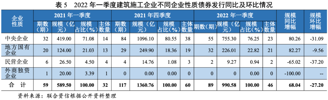 中央企業(yè)在發(fā)行規(guī)模上明顯領(lǐng)先其他所有制企業(yè)。從企業(yè)性質(zhì)看,2022年一季度,建筑施工企業(yè)中新發(fā)債主體46家,同比增長43.75%,環(huán)比下降23.33%;其中,中央企業(yè)23家,占50.00%,同比增加6.25個(gè)百分點(diǎn),環(huán)比下降13.33個(gè)百分點(diǎn)。同期,中央企業(yè)共發(fā)行債券55期,同比增長71.88%,環(huán)比下降34.52%;發(fā)行規(guī)模755.30億元,同比增長80.26%,環(huán)比下降31.09%。2022年一季度,中央企業(yè)發(fā)行規(guī)模占總規(guī)模的76.25%,同比增加5.17個(gè)百分點(diǎn),環(huán)比下降4.30個(gè)百分點(diǎn)。