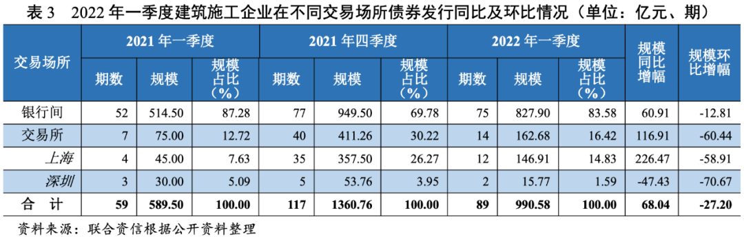 2022年一季度,建筑施工企業(yè)發(fā)債數(shù)量及發(fā)行金額同比有所增長,但環(huán)比有所下降;從交易場所看,銀行間市場債券發(fā)行期數(shù)和規(guī)模繼續(xù)領(lǐng)先于交易所市場;從發(fā)行主體級別看,發(fā)行主體向高等級集中趨勢未發(fā)生變化;從企業(yè)性質(zhì)看,中央企業(yè)在發(fā)行規(guī)模上明顯領(lǐng)先其他所有制企業(yè)。