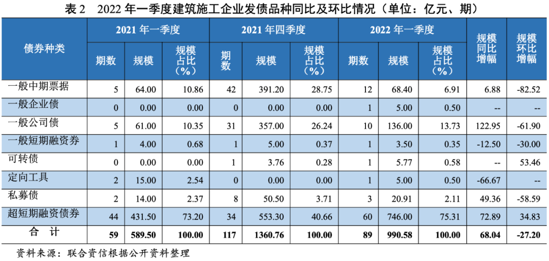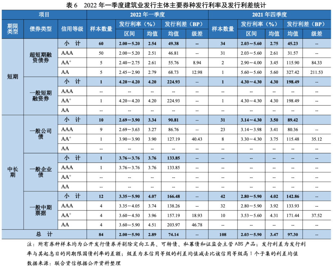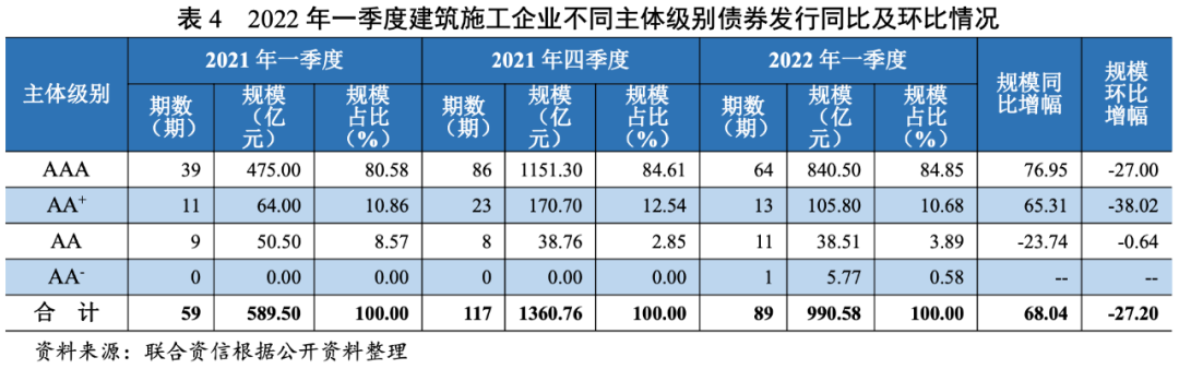 ?2022年一季度,建筑施工企業(yè)發(fā)債數(shù)量及發(fā)行金額同比有所增長,但環(huán)比有所下降,高信用等級主體融資優(yōu)勢明顯;從發(fā)行主體級別看發(fā)行主體向高等級集中趨勢未發(fā)生根本性變化。