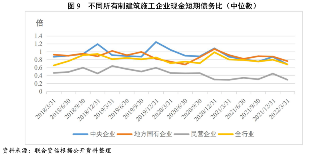 短期償債能力方面,截至2022年3月底,建筑施工企業(yè)貨幣資金/短期債務(wù)中位數(shù)為0.68倍,較2021年3月底和2021年底分別下降15.13%和4.79%,行業(yè)短期流動性壓力進(jìn)一步凸顯。