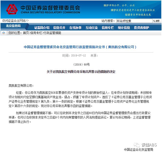 原標(biāo)題: 北京證監(jiān)局對(duì)奧凱航空出具ABS警示函,未足額歸集現(xiàn)金流,侵占損害專項(xiàng)計(jì)劃資產(chǎn)!