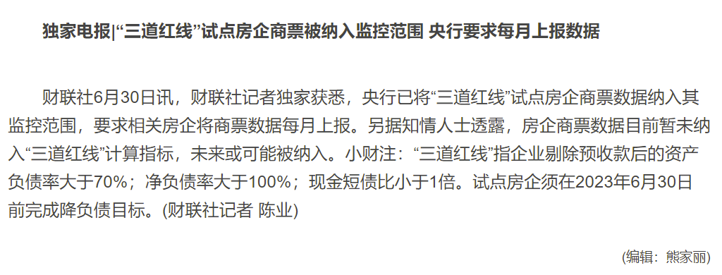 目前的口徑是,“三道紅線”試點房企需要逐月上報商票數(shù)據(jù),納入監(jiān)控范圍。