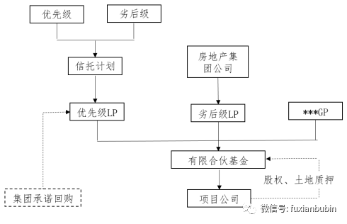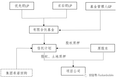 如果需要進入較為穩(wěn)健的大量資金,還需要集團予以承諾回購,并提供股權(quán)、土地的質(zhì)押,其交易結(jié)構(gòu)基本如下:
