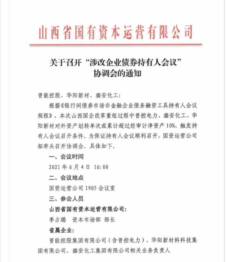 業(yè)內(nèi)近兩日傳播的一份文件顯示,山西國資于6月4日組織了晉控集團、華陽新材料、潞安化工等幾家省內(nèi)企業(yè),計劃協(xié)調(diào)召開“涉改企業(yè)債券持有人會議”:
