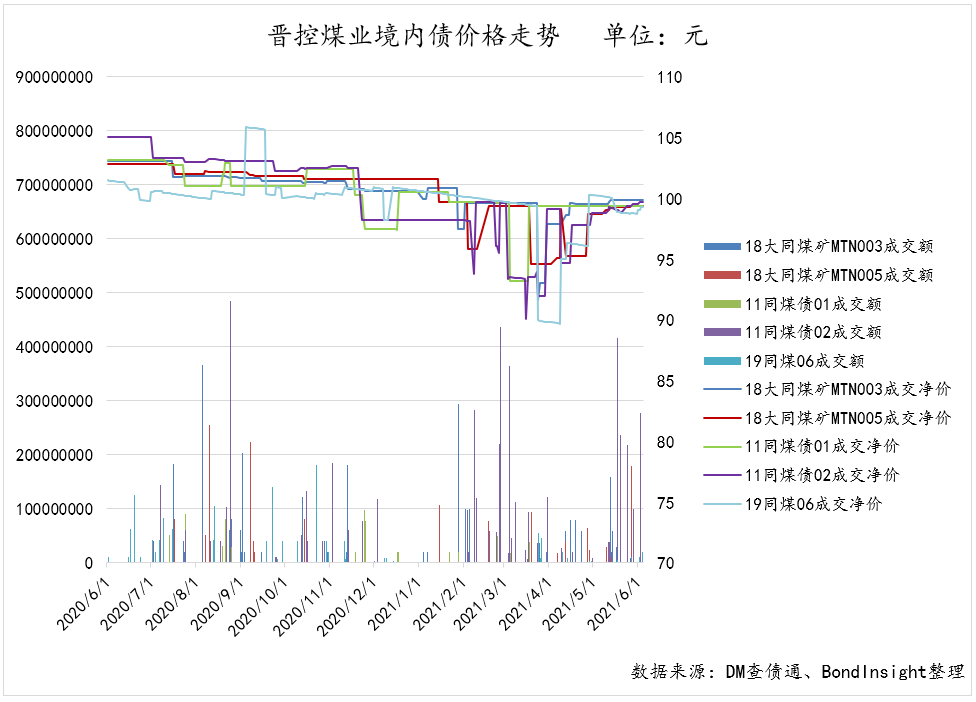 隨著信用債市場的信心修復和煤炭價格的抬升,煤炭產(chǎn)業(yè)債券估值上行的壓力略有緩解,前期二級市場價格下挫較大的煤企債券,5月以來都有修復態(tài)勢,以山西煤企整合進程中的主角晉能控股煤業(yè)集團(下稱“晉控煤業(yè)”,原“同煤”)為例,多只債券的成交凈價都回到了95-98附近。