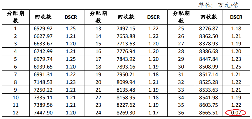 以“北京城市副中心投資建設(shè)集團(tuán)有限公司2019年度第一期資產(chǎn)支持票據(jù)”為例,最后一期回收款對優(yōu)先級證券的應(yīng)付本息覆蓋倍數(shù)僅有0.07倍,可以推測,最后一期的優(yōu)先級證券本金明顯較大。聯(lián)合評級披露,本交易優(yōu)先級票據(jù)的到期本息償付將依賴于發(fā)起機(jī)構(gòu)的再融資能力或抵押物處置變現(xiàn)價值,故聯(lián)合資信對于本交易 DSCR 測算不考慮最后年份。