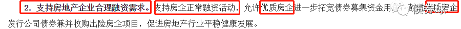 這一條重點自然不在“支持房企正常融資活動”,作為官方機構,如果連正常融資活動都不支持,肯定不合適。對于這部分,筆者關注的重點在于“優質房企”。從具體內容來看,如果發行人被認定為優質房企,其將獲得的政策支持是毫無疑問的。可惜的地方在于,這里并沒有給出優質房企的標準,大概監管部門也有難為的地方吧。