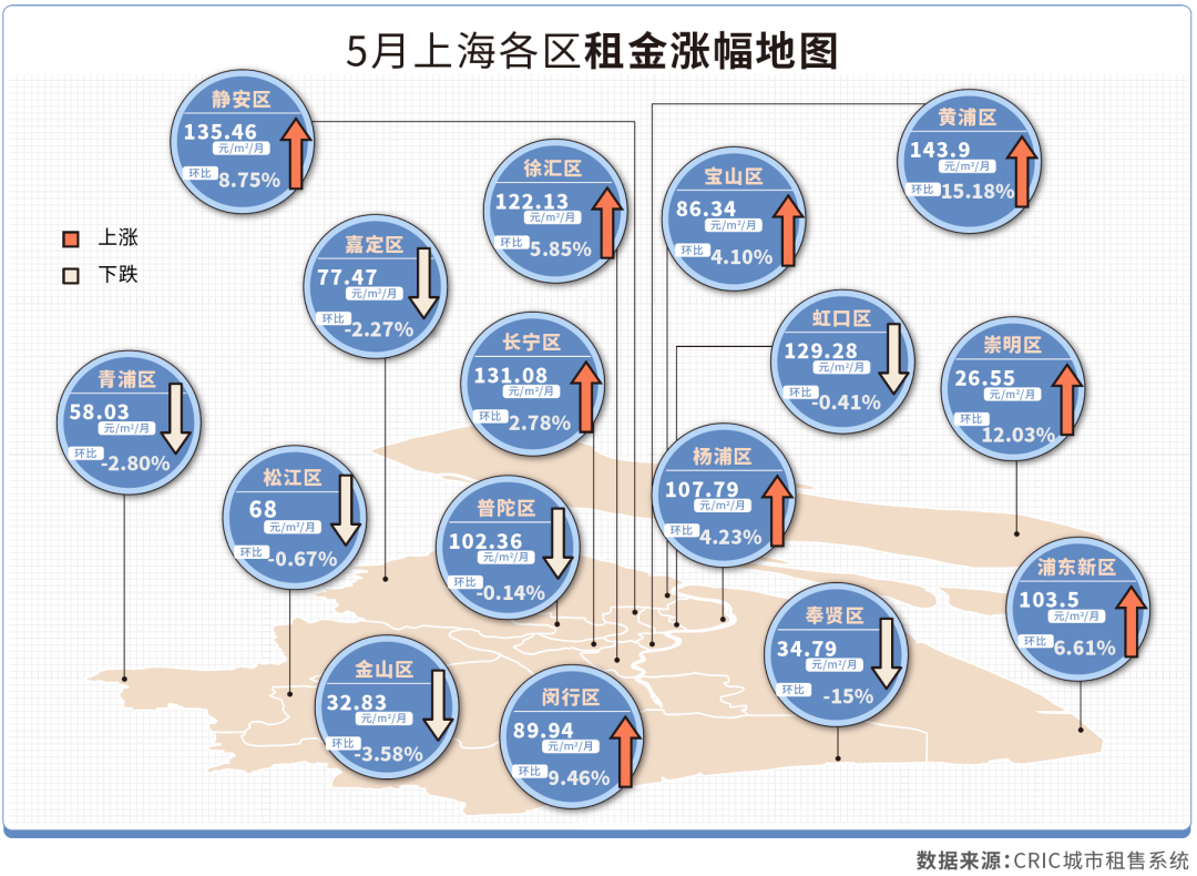 5月,上海個(gè)人房源租金為102.51元/平方米/月,排在55城之首,也是唯一一個(gè)每平米月租金破百元的城市;環(huán)比上漲6%,漲幅排在55城前三。