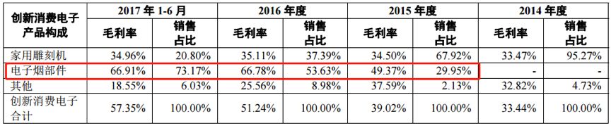根據招股書,2017年1-6月,公司電子煙部件產品毛利率為66.91%。以下為相關截圖: