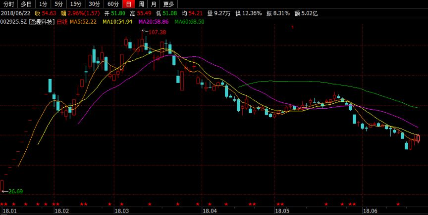 股價也從高位回落。新股上市之后,盈趣科技股價在2018年3月達到高點,之后持續下滑,至今跌幅近半。直接上圖: