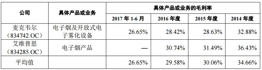從公司招股書披露的同行業對比來看,2017年1-6月,同行業相關產品毛利率平均值為26.65%,與盈趣科技電子煙部件產品毛利率相差40個百分點。