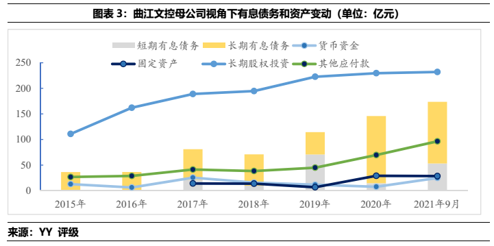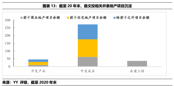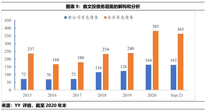 2)曲文投而言,屬于弱城投屬性主體,母公司層面資金沉淀于體系內子公司(36.05億)、地產相關(86.44)、城投相關(11.98億),文旅(7.23)和其他產業(10.61億)等;合并報表而言,涉房資產的體量下限值(332.69億)扣除預售后(130億)占合并報表有息債務(382億)的比重在53%左右。